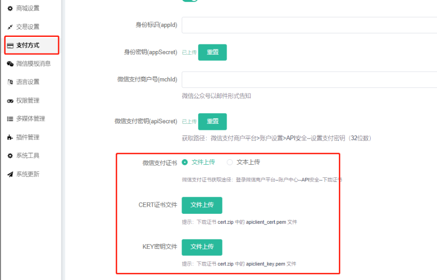 注意:若商城小程序的是跟公众号共用同主体的微信商户号,后台小程序的微信支付两证书也要重新上传.