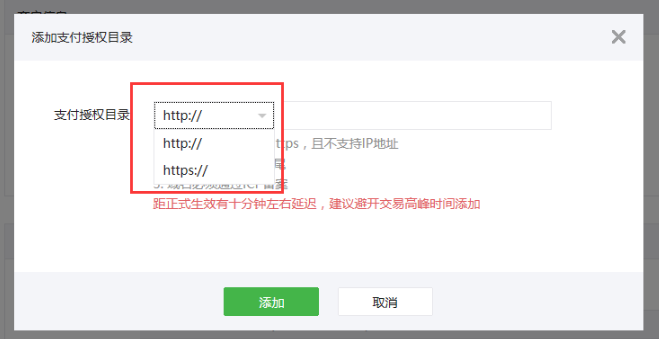 1)支付授权目录的前缀(http/https)——请点击“▼”下拉选择“https://”,不要选http://