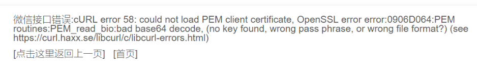 十一、打款到微信提示微信接口错误:cURL error 58:could not load PEM client certificate,OpenSSL error error:0906D064:PEM routines:PEM_read_bio:bad base64 decode,(no key found,wrong pass phrase,or wrong file format?)(see https://curl.haxx.se/libcurl/c/libcurl-errors.html)