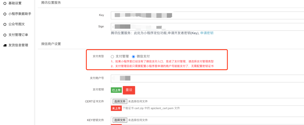 登录小程序平台mp.weixin.qq.com,检查左侧菜单“功能”显示的微信支付是“微信支付”,还是“支付管理”。若显示微信支付,商城后台小程序支付类型对应选择微信支付的。选择后配置好小程序关联的商户号,支付密钥和上传商户证书。